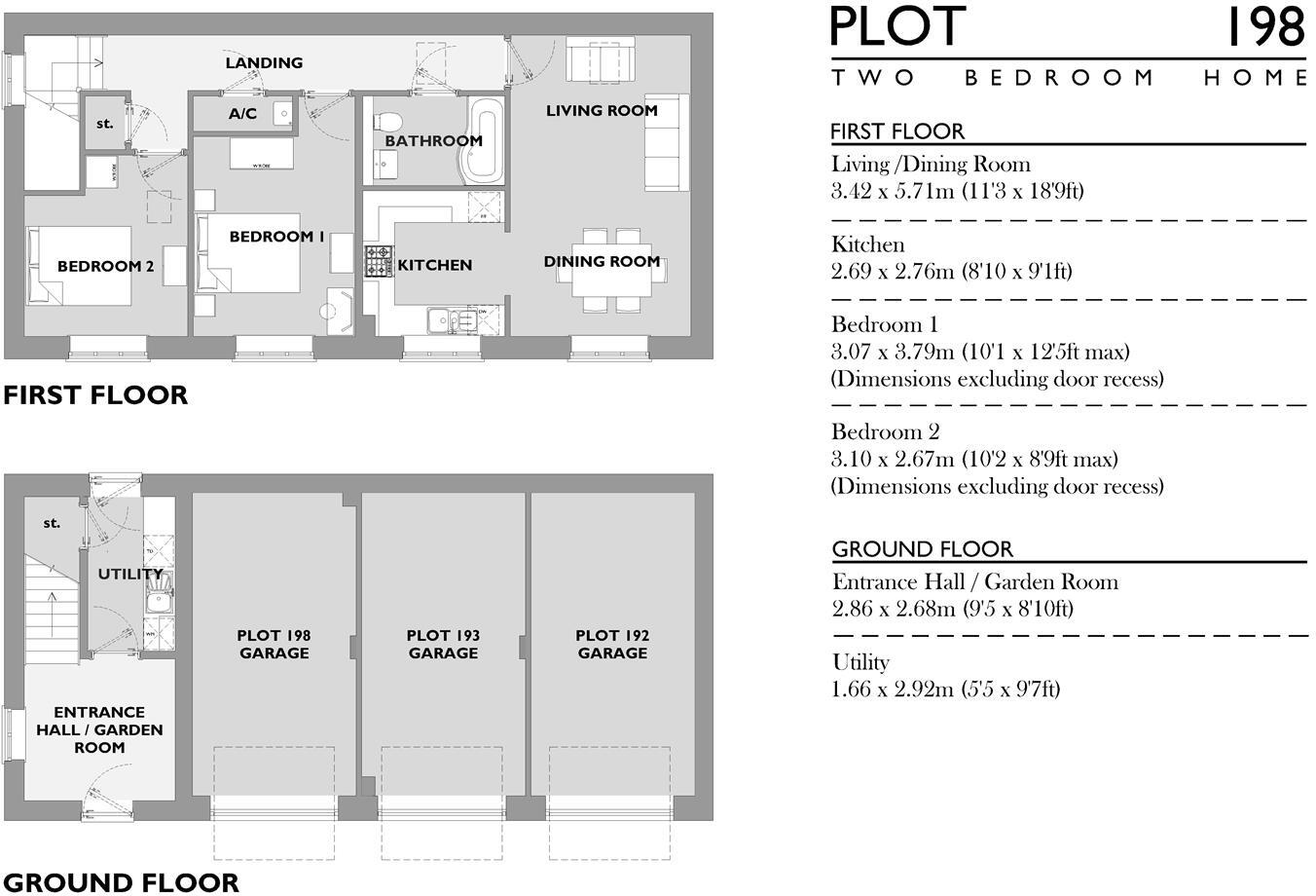 An individual Coach House, plot 198 includes open plan accommodation, utility room, two double bedrooms, single garage with parking space to the side.