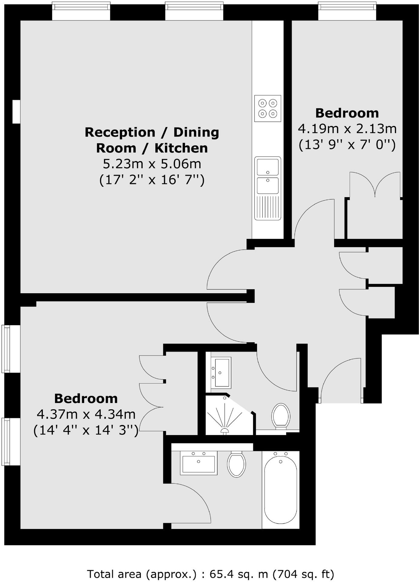 A smart, well proportioned two double bedroom, two bathroom furnished apartment in a period conversion, offering an open plan kitchen with wood floors and space for dining.