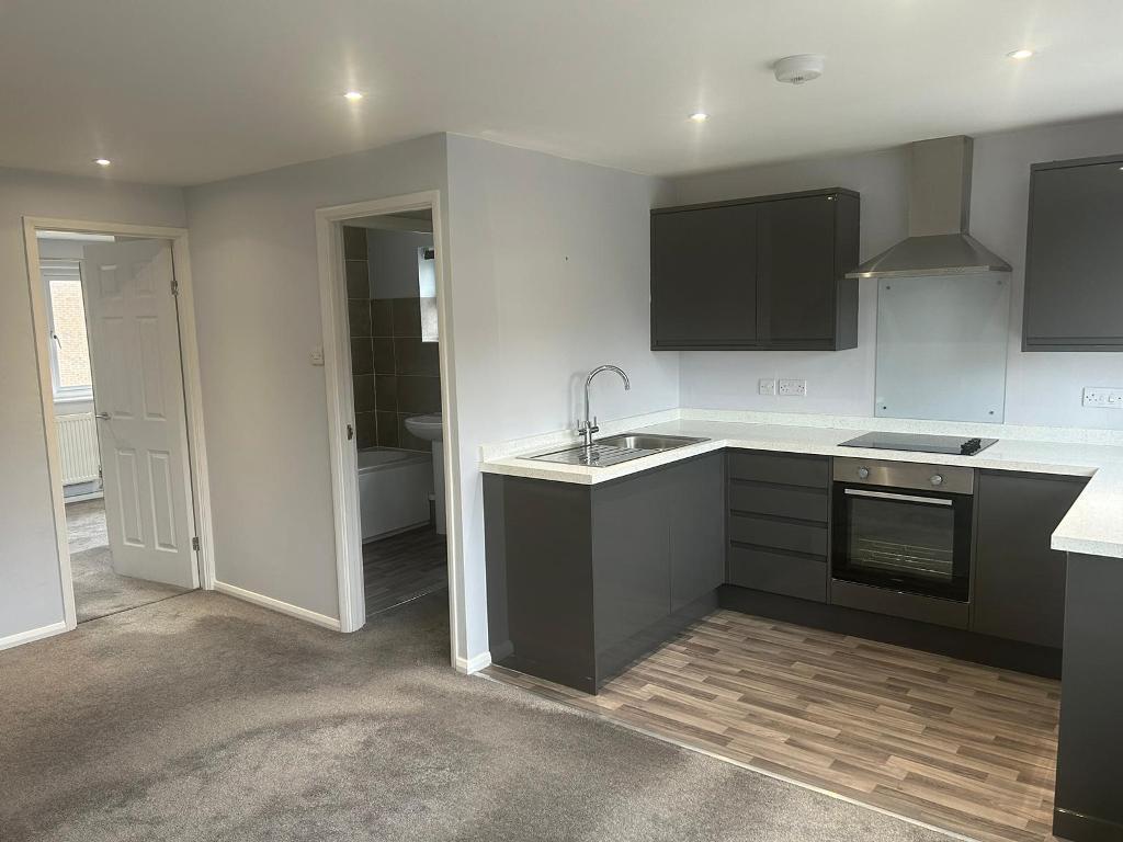 A one bedroom first floor maisonette with an open plan lounge / kitchen. The kitchen is a modern high gloss charcoal grey with single oven, hob, fridge. There is a small utility are with space for a ...