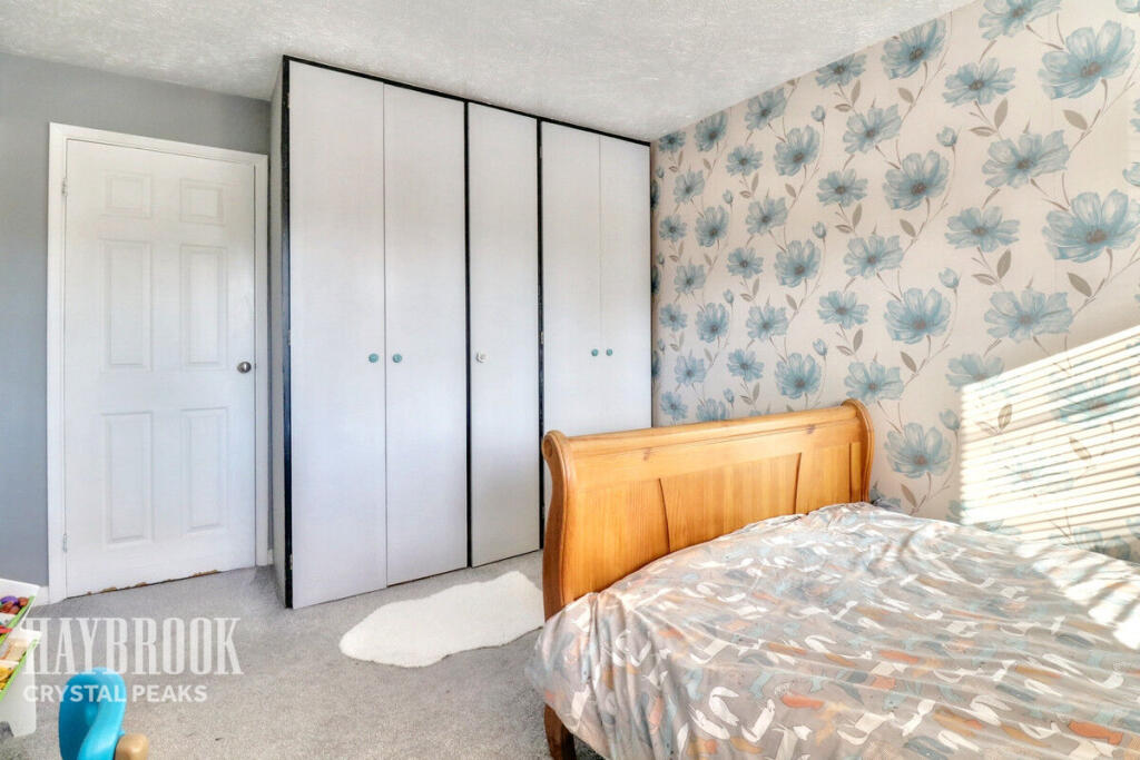 The property is located near several schools, including St Giles Cofe Primary School (0.42 KM) and Immaculate Conception Catholic Primary School (2.06 KM), as well as more distant secondary school options. Train stations such as Woodhouse and Kiveton Bridge are approximately 6 and 7 km respectively. The provided data doesn’t include the proximity to local shops and other amenities. The photos show the property as being in relatively good condition, however, the lack of interior shots of the other bedrooms prevents a more in-depth conclusion. The outdoor space is relatively compact, consisting mostly of a paved patio area and some planting.