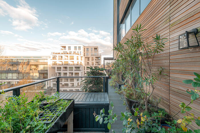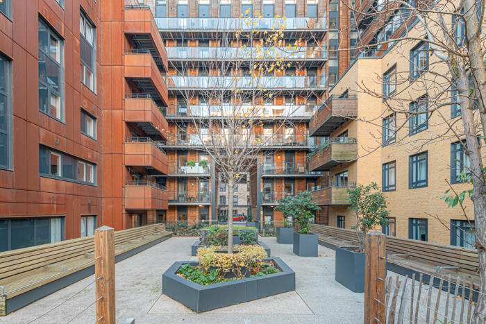 A two bedroom two bathroom apartment on the 6th floor of The Cooper Building with an expansive private wrap around terrace and views over the greenery of The Wenlock Basin. Furnished, available immediately.