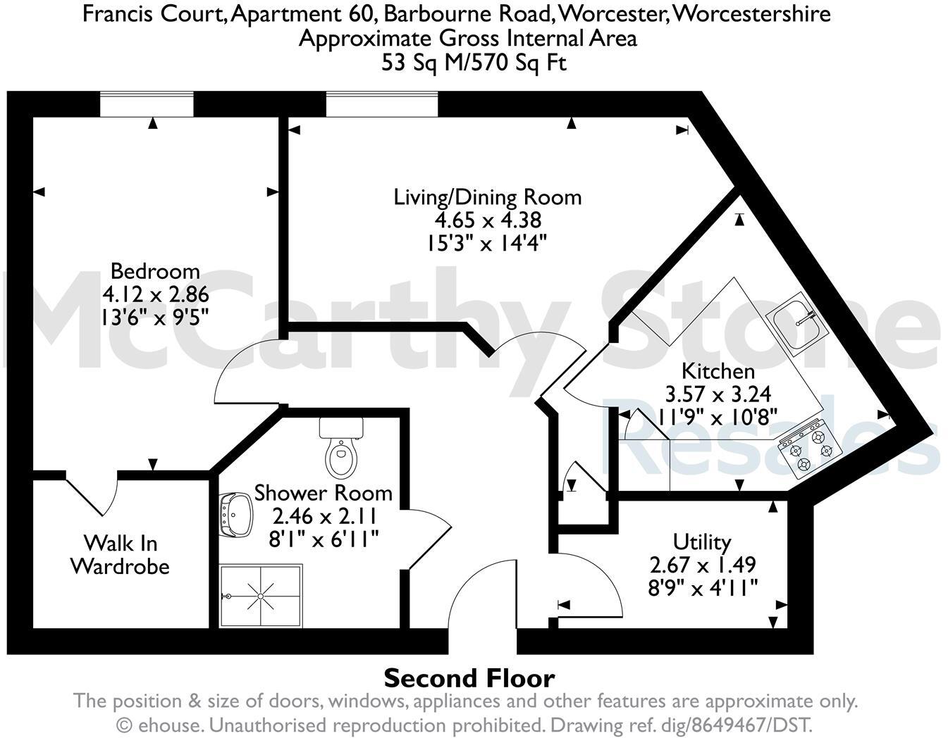 A bright and spacious one bedroom second floor retirement apartment. Part of McCarthy & Stones Retirement Living Range for over 60's. The apartment comprises of a spacious living room with a modern fitted kitchen with integrated appliances. Double bedroom and tiled shower/wet room.