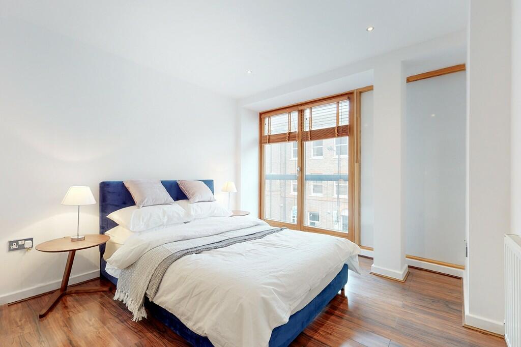 2 bed apartment in Heneage Street off Brick Lane, on the first floor, semi open plan, dual aspect living room, wood flooring, video entry, Juliette balcony, custom-built wardrobes, double glazing, tiled bathroom, with a landscaped communal garden and bike storage.