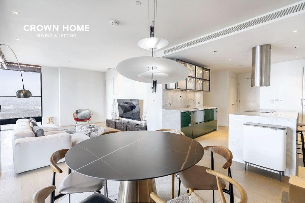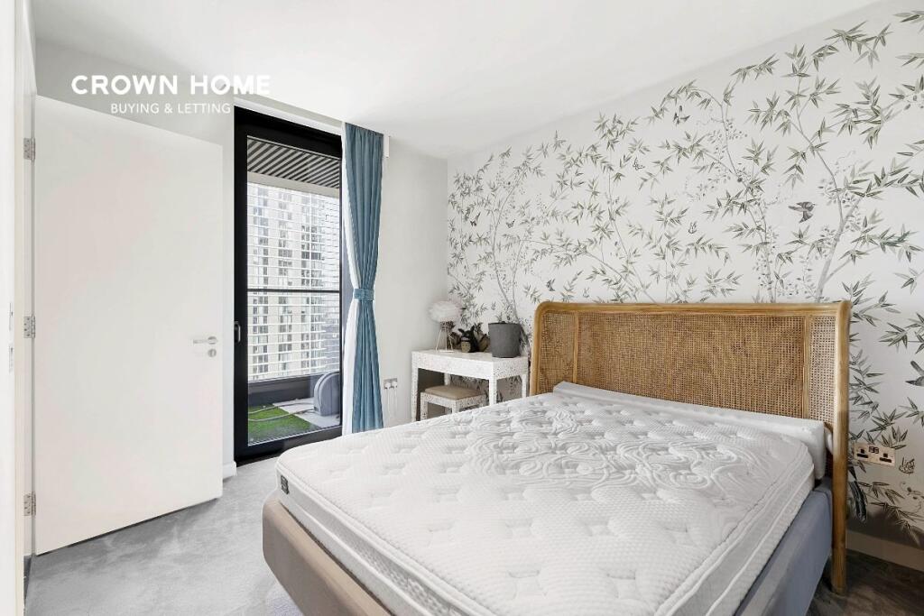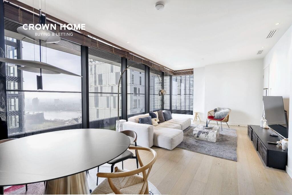 *Video tour available in photo gallery* Minutes from Canary Wharf, this serene apartment boasts stunning views of The Shard, City, & river from its wraparound balcony.