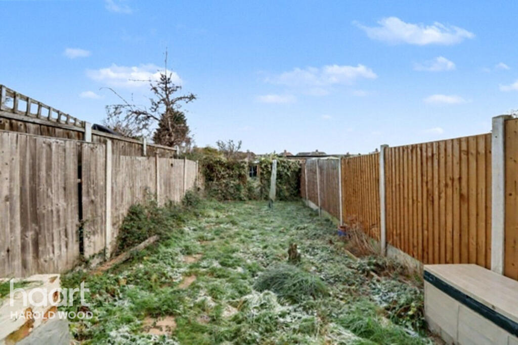 Well-presented three-bedroom mid-terrace on a quiet turning. Bright, spacious rooms over a practical layout. Driveway for two cars, plus private rear garden with garage. Easy access to A12, A127, M25, Romford & Harold Wood stations, schools and amenities