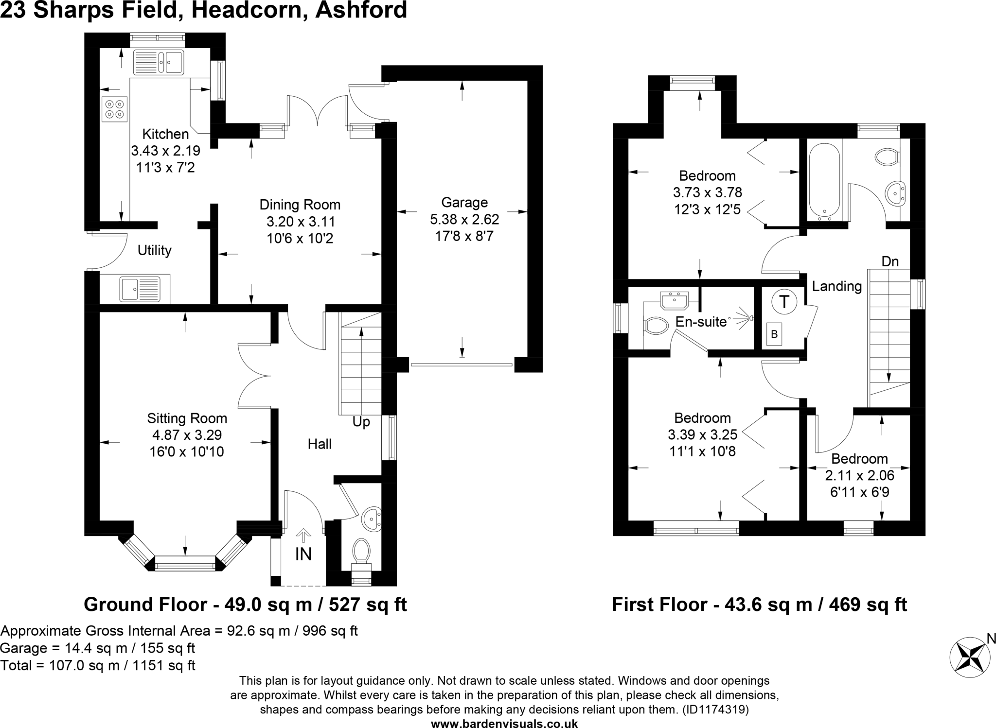 The property is located in Sharps Field, Headcorn, Ashford, Kent, TN27 9UF. It’s a three-bedroom, two-bathroom detached house with a total area of 1,151 square feet. The list price is £450,000.