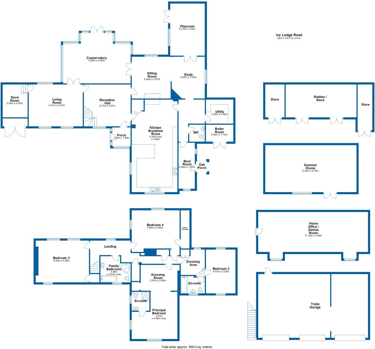 A spacious country home set within 6.7 acres of stunning grounds, featuring a long private driveway, a triple garage with a home office, and multiple outbuildings.
