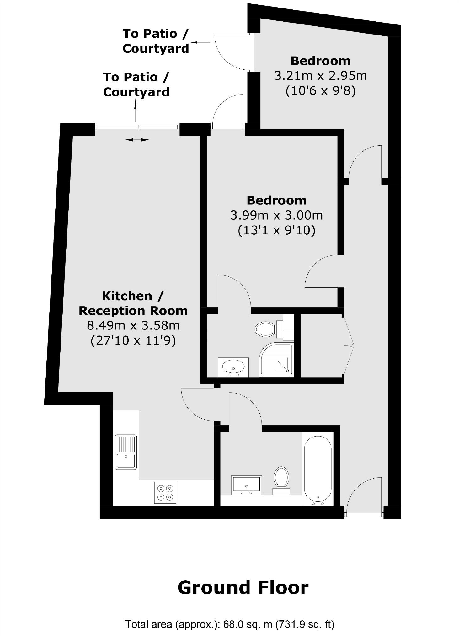 A two bedroom, two bathroom apartment on the ground floor with private outside space. Residents benefit from bespoke designed kitchens, a 999 year lease and a new build warranty of 10 years. Bespoke designed kitchens from German Kitchen Projects including all white goods and full warranty.