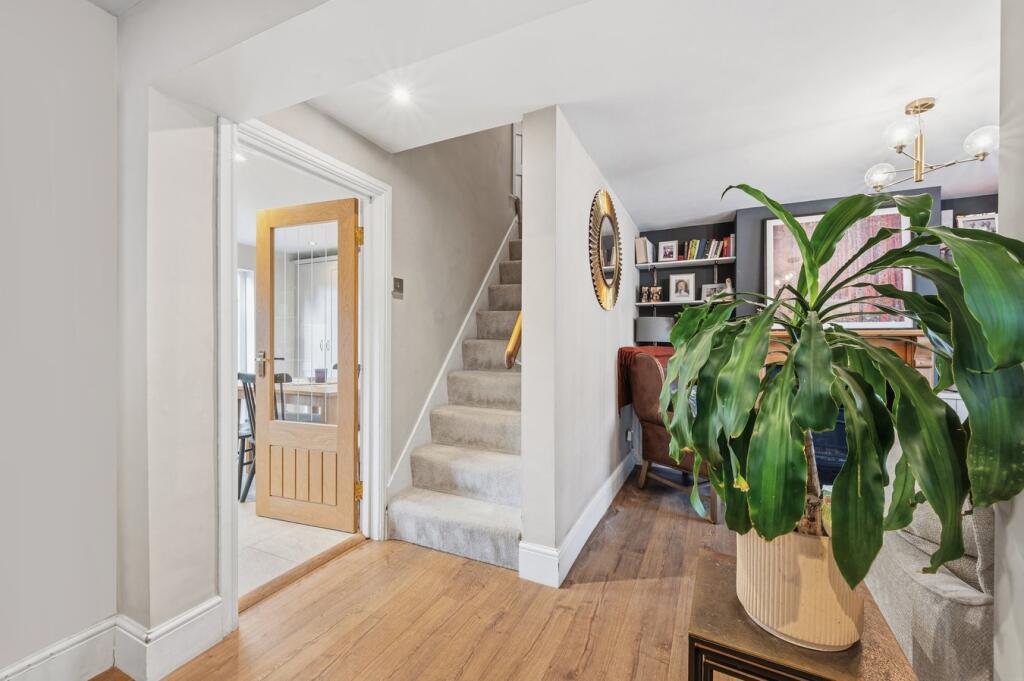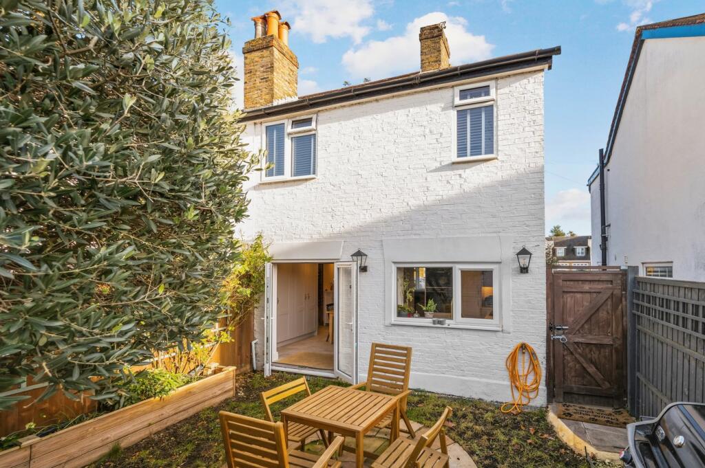 Charming remodelled period home in central Hersham Village, near shops and station, featuring two double bedrooms, open-plan kitchen/diner, garden, and stylish modern interiors throughout today.