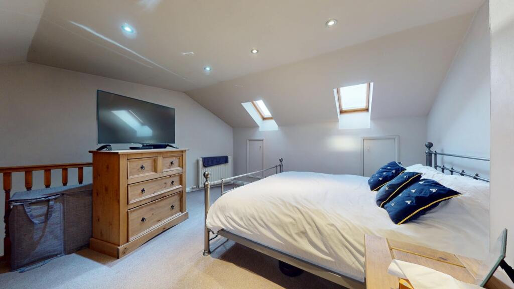 Generous 3-bedroom, 3-floor terraced home close to South Shields coastline. Features a large living room with focal mantel, spacious kitchen for dining, downstairs WC, family bathroom, top-floor main bedroom with fitted wardrobes, driveway, garage, and secure rear yard with electric roller door.