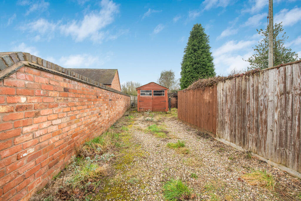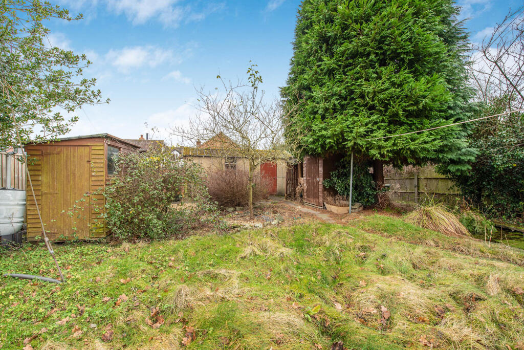 The property includes a garden, although the size is not specified. The images show a garden area that is relatively unkempt, with grass and leaves covering the ground. The presence of a garden adds to the property’s appeal, particularly for families.