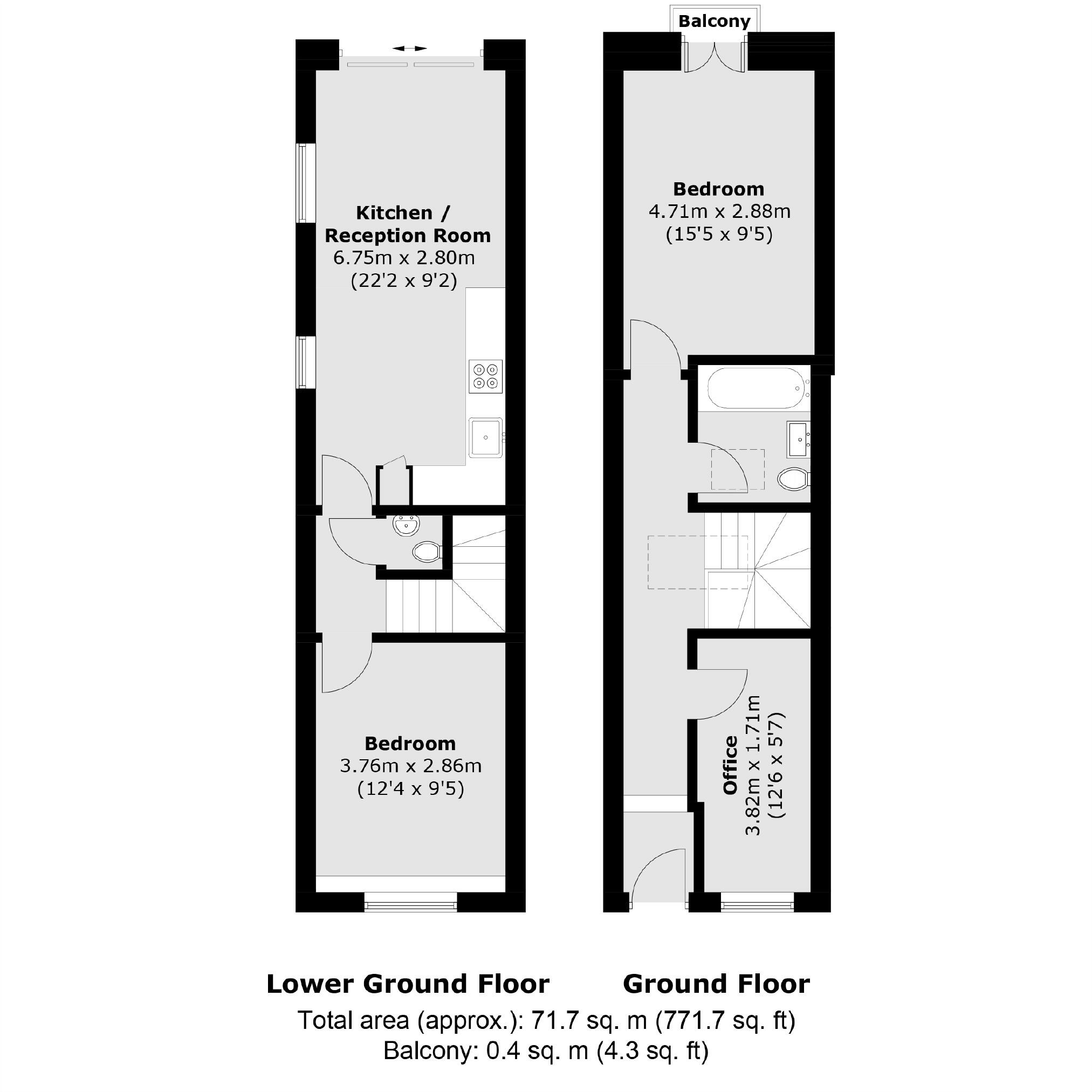A newly refurbished split level two bedroom property. The property has an open plan living area that leads out onto a private courtyard as well as a separate study room.