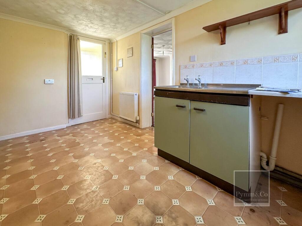 This is a semi-detached bungalow in Langham, North Norfolk. The property requires renovation, particularly in the kitchen and bathroom. The garden also needs attention. Langham Village School is nearby and has an ‘Outstanding’ Ofsted rating. Considering its location and the need for renovation, the asking price of £210,000 offers good value.