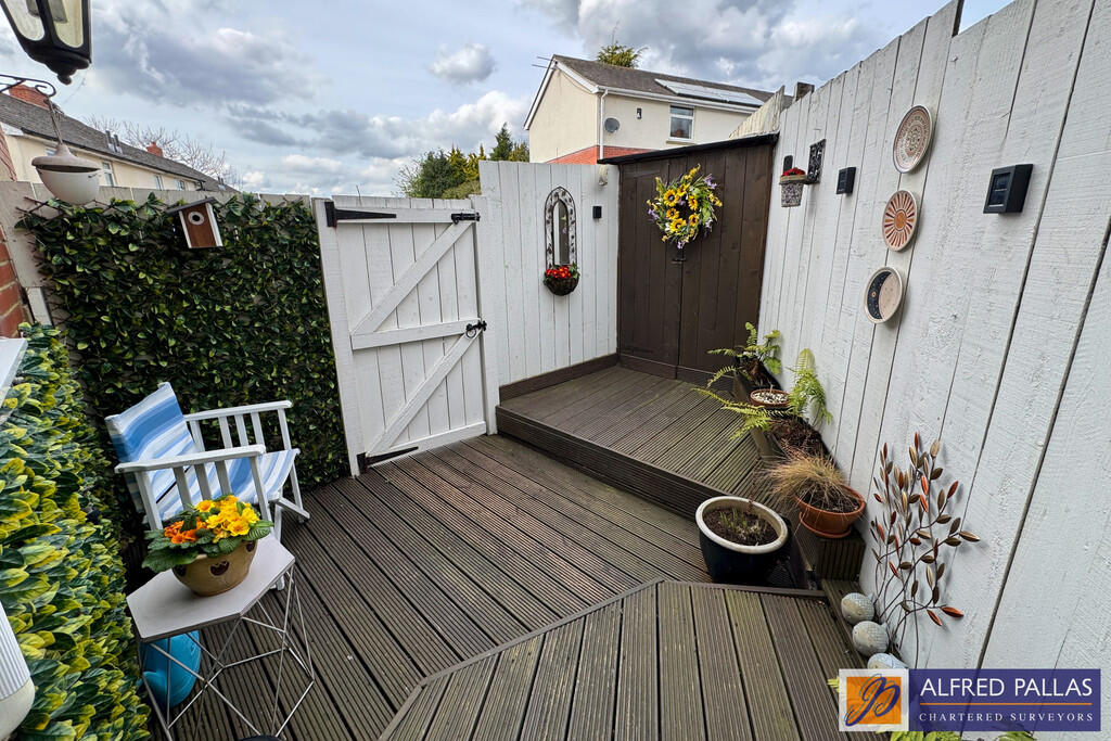The property includes a private rear garden with decking, providing outdoor space. The size is not specified, but the images show a usable area.