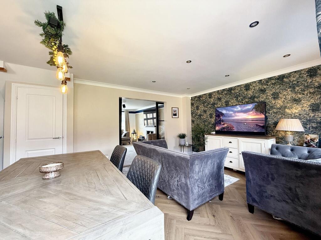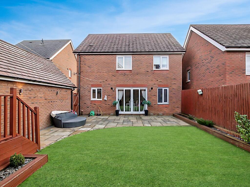 The property is a 4-bedroom, 2-bathroom detached house located in Penallta, Caerphilly, with a list price of £425,000. The property has a total area of 1,191 sqft and sits on a 1,348 sqft plot. This is a modern property in good condition, as shown in the photos. The interior is well-maintained and recently decorated, with modern fixtures and fittings. The kitchen and bathrooms appear to be recently updated, and the property has a good-sized garden with a patio area.