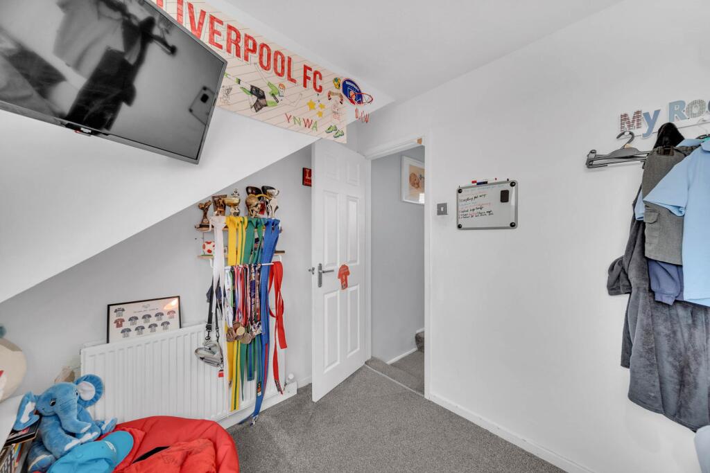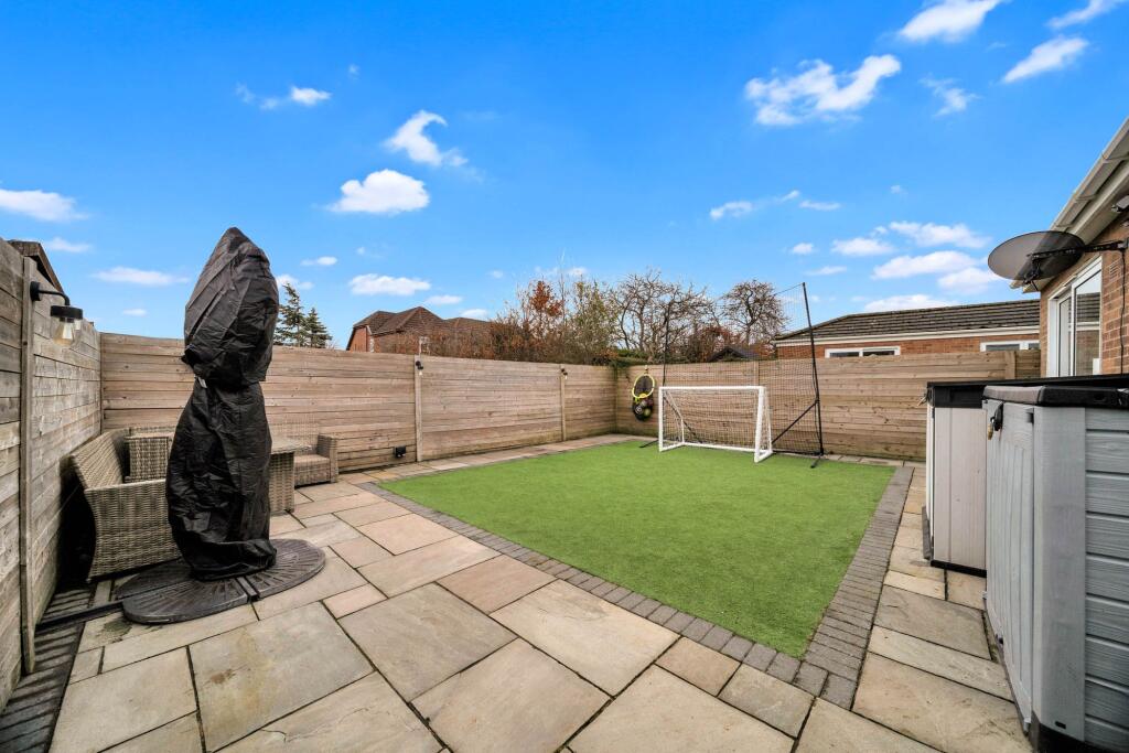 The property is a 4-bedroom bungalow located on Redwood Drive, Ormskirk, in Lancashire. It boasts a modern, well-maintained interior with a newly fitted kitchen and updated living spaces. The images showcase a contemporary style throughout the house, suggesting recent renovations or a high standard of upkeep. The exterior also appears to be in good condition, with a paved driveway and a well-maintained garden featuring artificial turf. The presence of a garden contributes positively to the overall appeal and value of the property.