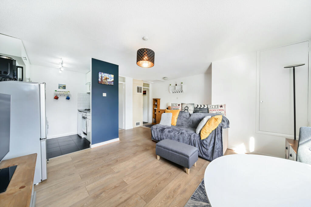 This one-bedroom, one-bathroom maisonette in Mytchett, Surrey, is presented as a well-maintained and modern property. The interior features a recently updated kitchen and bathroom, giving it a contemporary feel. The living space is open-plan, creating a sense of spaciousness. The presence of built-in storage in the bedroom is a positive attribute. Access to communal gardens is included and there is at least a small private garden area.
