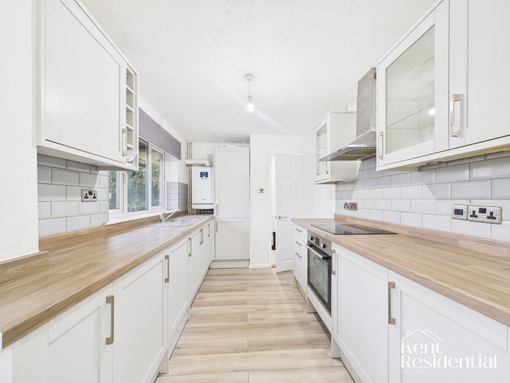 This is a three-bedroom terraced house in Walderslade, Medway. The property appears to be in generally good condition, with a modern kitchen and bathroom. The garden is a reasonable size but needs some attention. The property is located within a reasonable distance of schools and transport links. The asking price of £275,000 seems reasonable for the area.