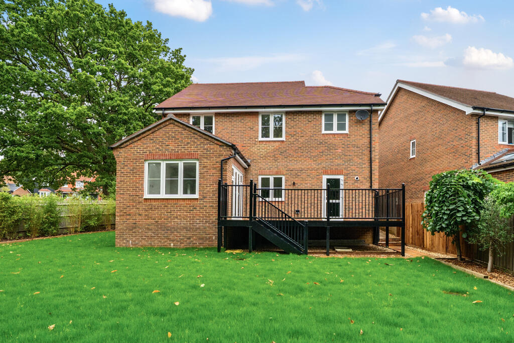 The property is a detached house in Wrecclesham, Farnham, Surrey. It features four bedrooms, three bathrooms, and a modern design. Nearby are good transport links and well-regarded schools. The house has a well-maintained garden and patio. The asking price seems reasonable considering the condition, features, and location.