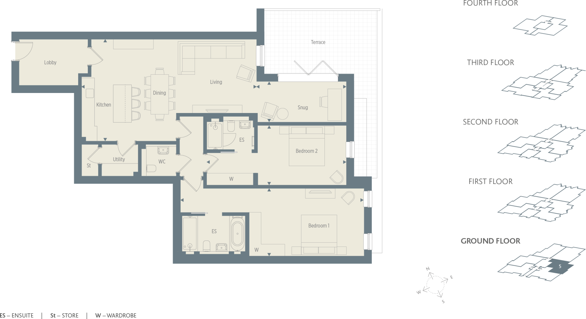 Apartment 5 is a luxuriously appointed ground floor apartment with open-plan living, utility room, large private terrace and underground parking. Each of the two bedrooms feature stylish ensuites and built-in wardobes.