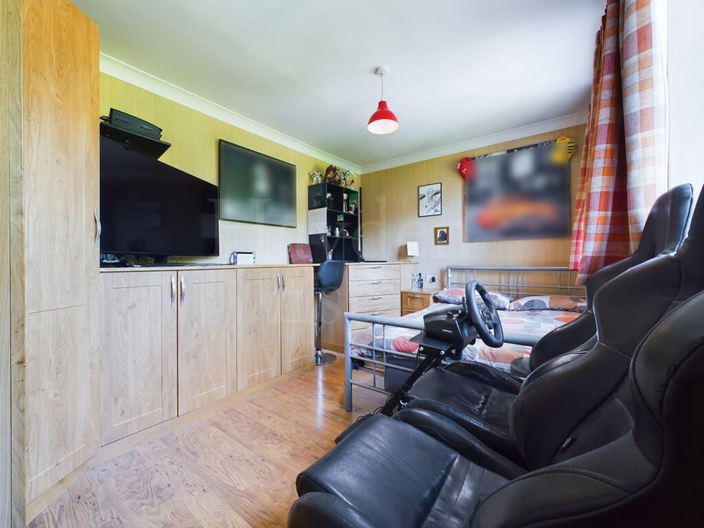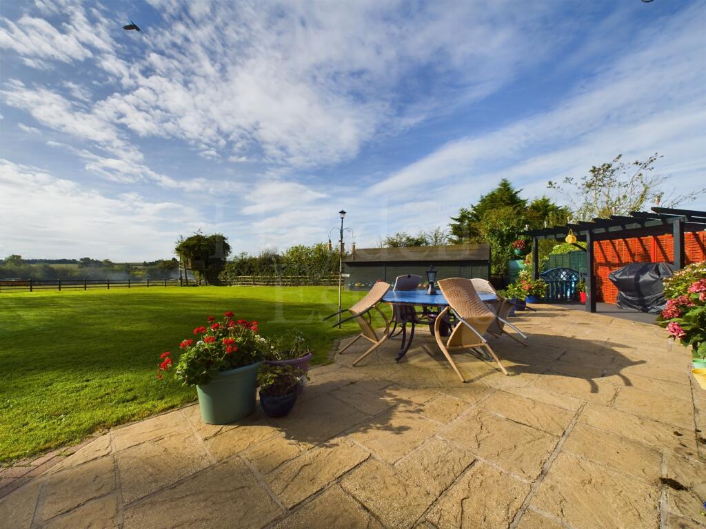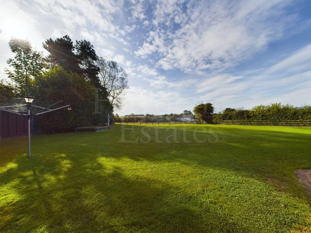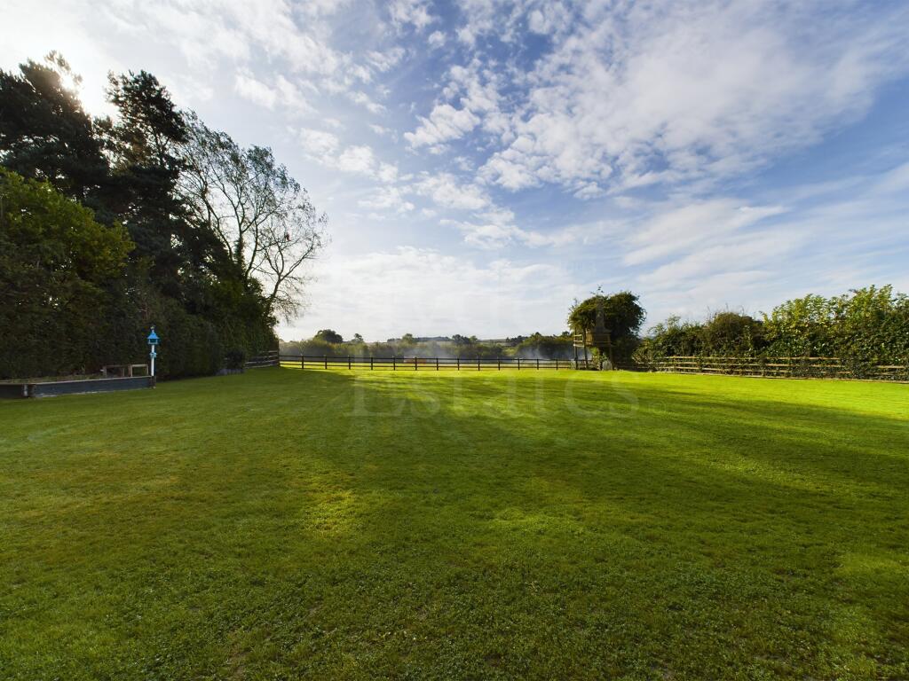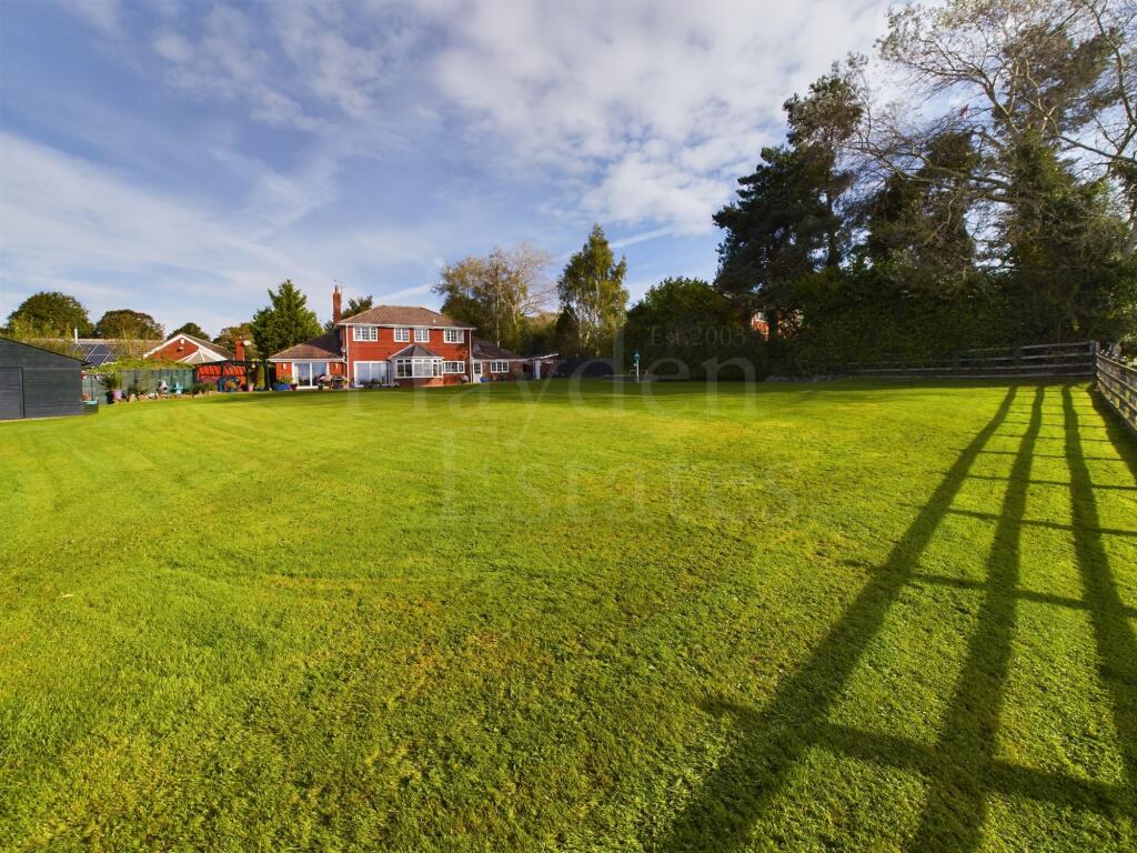 The property includes a large garden, which is a significant asset. The extensive lawn area is well-maintained, and the photos show a patio area suitable for outdoor entertaining. The presence of a shed suggests ample storage space. The size of the plot is not specified, which could impact the overall assessment.