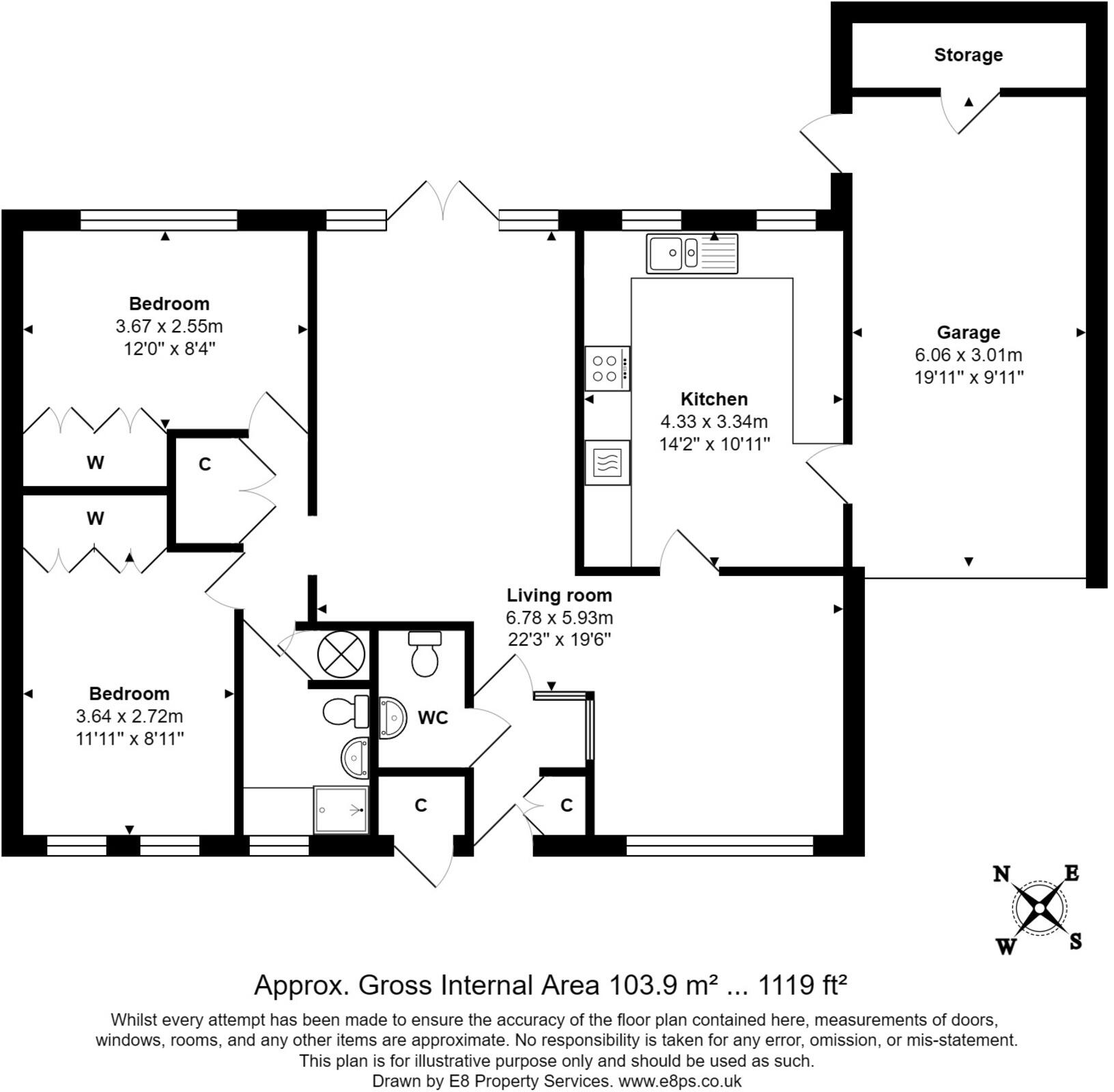 A two double bedroom bungalow with large front and rear gardens, driveway parking and garage. The property has been modernised including new kitchen, carpets and redecoration. The entrance porch has a storage cupboard and WC, with door to the open-plan living room and dining space, feature firepl...