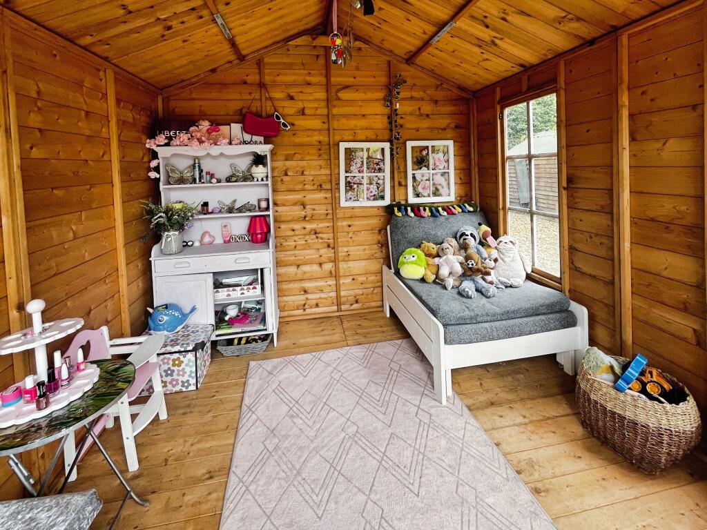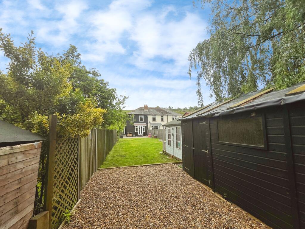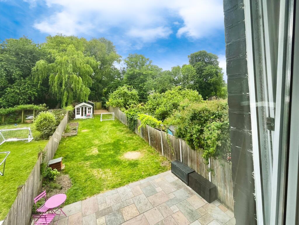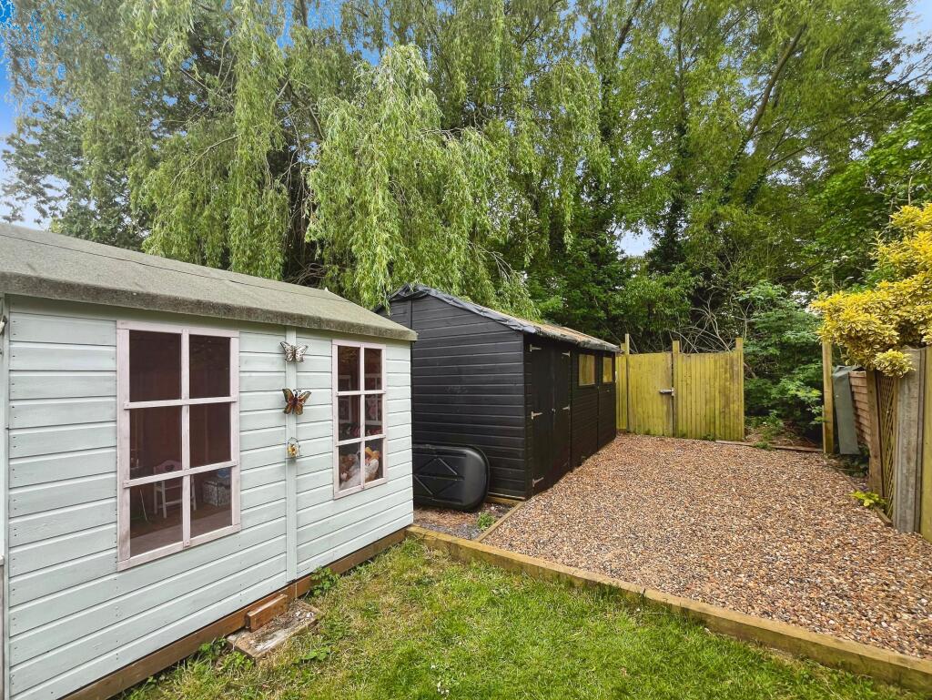 The property includes a sizeable garden, offering ample outdoor space. Images show a patio area, lawn, and garden sheds, suggesting a good-sized plot suitable for family use and potentially offering privacy.
