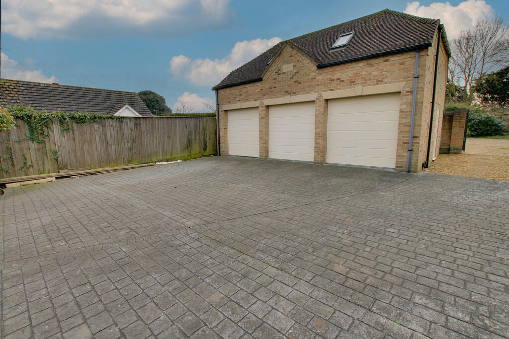 This property, located in March West, Cambridgeshire, is a substantial family home. Images show a well-presented interior with modern fixtures, fittings, and finishes throughout. The kitchen is a particular highlight, appearing spacious, modern, and well-equipped. The home also features what seems to be a dedicated home cinema, multiple bathrooms (including en suite facilities) and multiple bedrooms. The house appears well-maintained, clean and in a good state of repair. There is ample parking provided with a large triple garage. The outdoor space is limited however to a paved patio area and driveway with minimal greenery, however there is a surrounding brick wall. Overall, this is a large, modern, well-maintained family home in a reasonably convenient location. The absence of information regarding the plot size however is a significant omission and the price compared to other properties is notable.