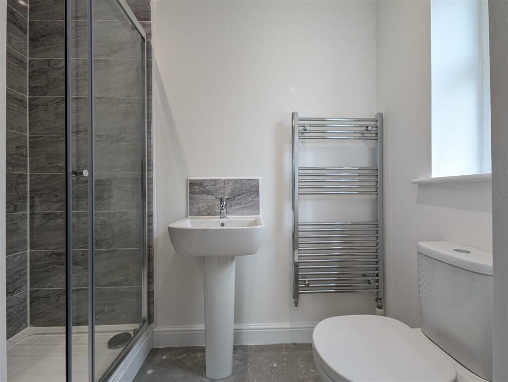 The imagery reveals a modern interior with what appears to be high-quality fixtures and fittings throughout. The kitchen, though shown with a bare floor, appears contemporary. The bathrooms display modern tiling and sanitaryware. The bedrooms show tasteful interior design and furnishings, which, while staged, offer a clear indication of the space and layout. The exterior presents a well-maintained brick build. The presence of a driveway and what looks like a double garage adds to the home’s appeal.