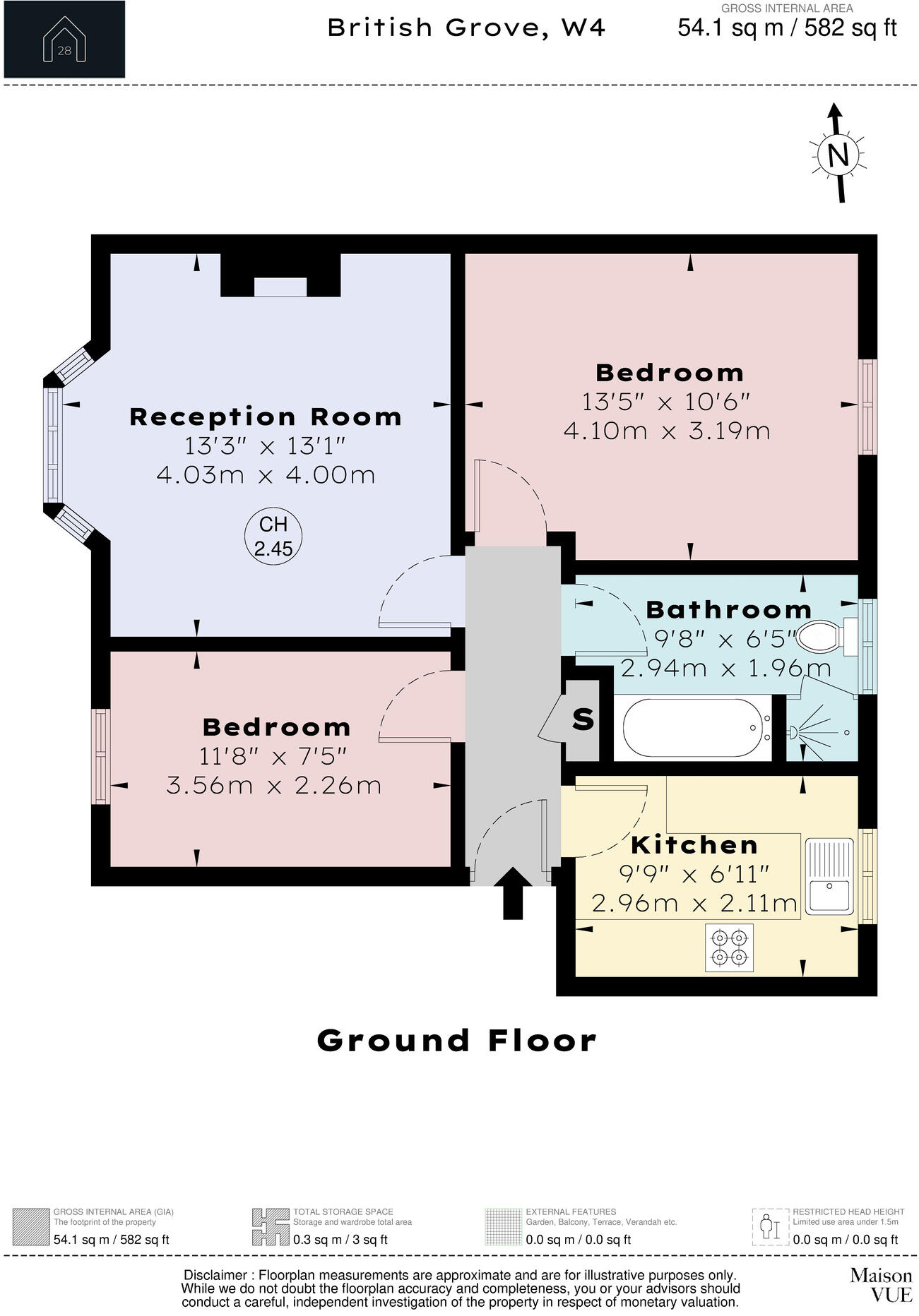 Located on a quiet residential turning just off Chiswick High Road, this two-bedroom ground floor flat offers well-balanced living accommodation extending to approximately 582 sq ft (54.1 sq m), and benefits from a long lease with approximately 946 years remaining.