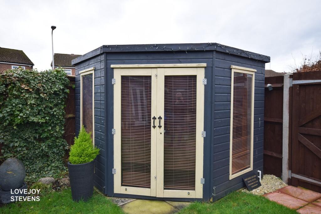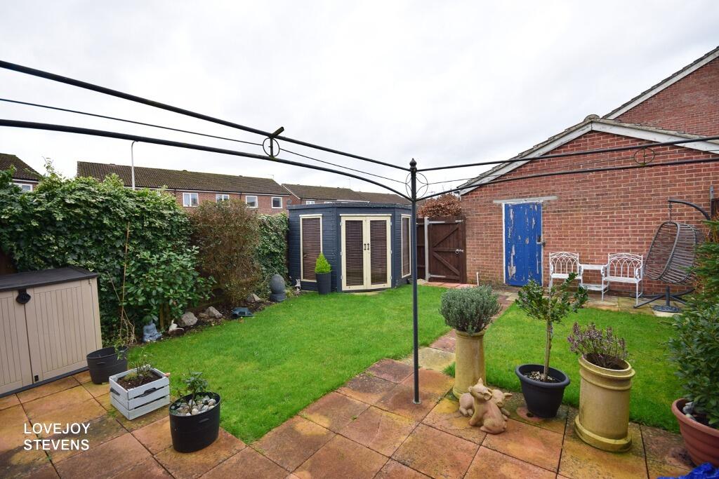 The property includes a garden, which adds to its appeal, especially for families. The garden appears to be of a reasonable size for the property type, with a patio area and a garden shed.