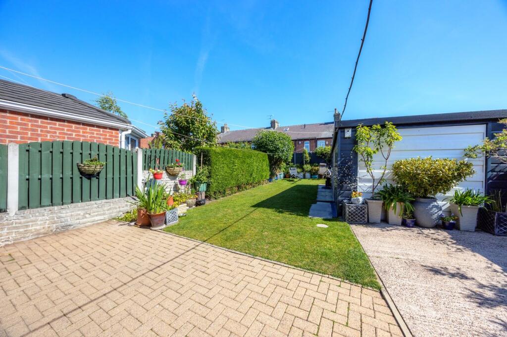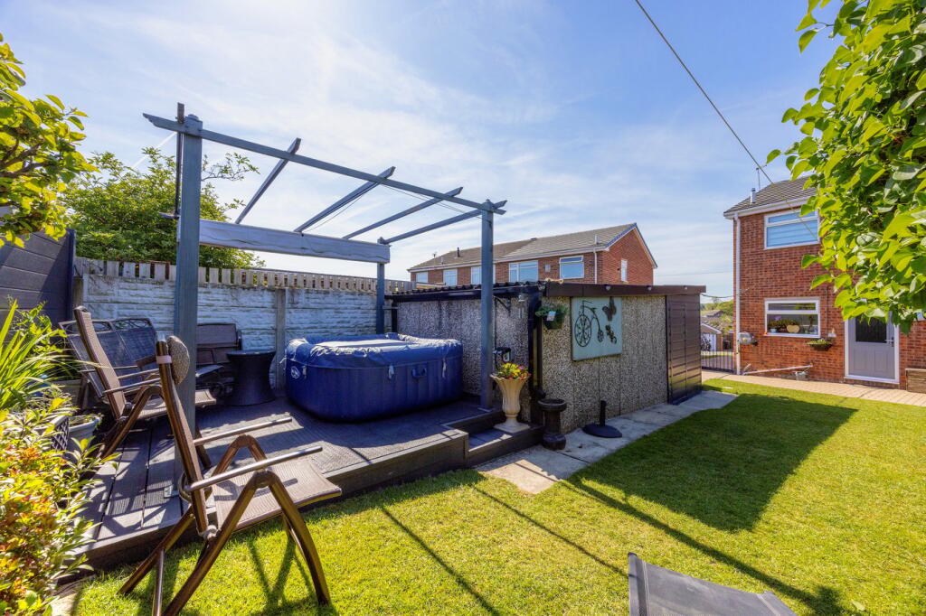 The property includes a garden, which appears to be of a good size and well-landscaped. It includes a patio area and a hot tub, adding to its appeal. The presence of a garage is also a positive feature.
