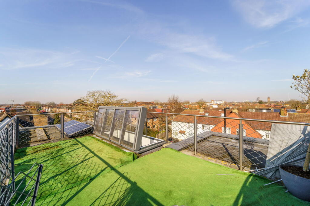 This is a modern two-bedroom apartment in Ealing, London. The property is in good condition and has a roof terrace. The property is located in a desirable area with good access to amenities, schools, and transportation. The property is listed for £500,000, which is above the average price for the area, but the condition and roof terrace may justify the higher price.