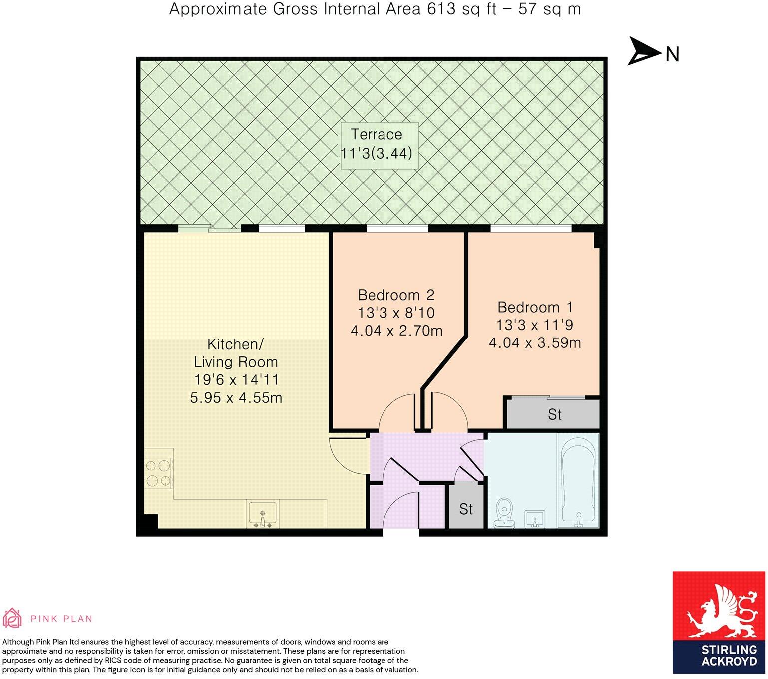 This approximately 613 sq. ft. two bedroom flat with a large terrace is situated in this purpose-built building on Violet Road. The property comprises an open-plan kitchen/living area with direct access to the private terrace, a family bathroom and two good-sized double bedrooms. The p...