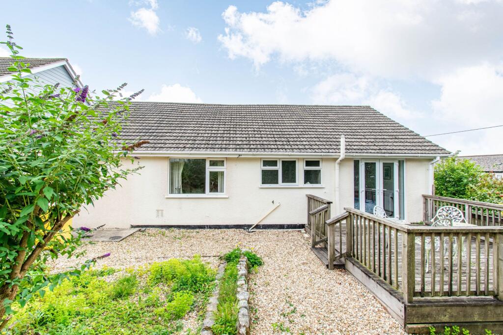 Bright corner plot bungalow with ample parking. En-suite principal bedroom, French doors to garden, dual-aspect third bedroom. Spacious lounge/dining room, fitted kitchen, utility room. Lawn, decking area, shed, near Bodmin Moor.