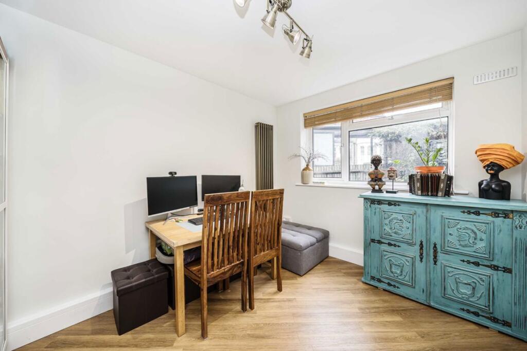 A ground floor modern flat comprising reception/dining room opening up to a new kitchen, two double bedrooms, a modern bathroom, wood flooring throughout. The property also boasts communal gardens.