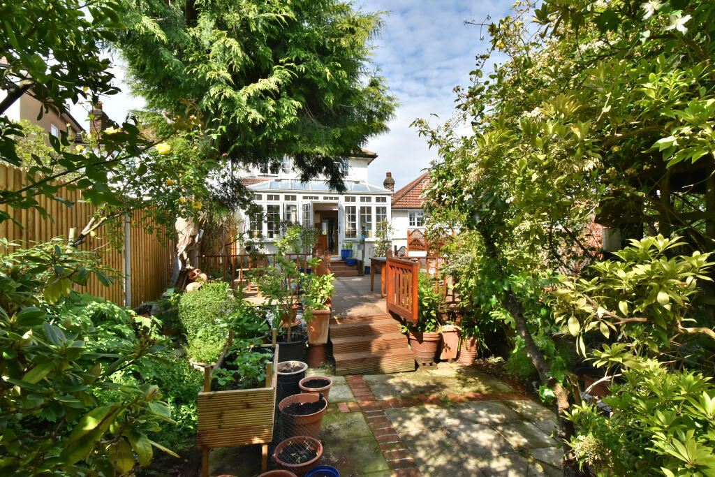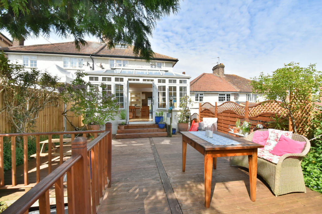 The property is located on Bexhill Road in Crofton Park, Lewisham, Greater London. The area benefits from good transport links and is close to several schools. The house appears to be in good condition, with modern kitchen and bathrooms. The property has a well-maintained garden with mature trees and a decked area. The asking price is £875,000, which seems reasonable given the condition and features of the property.