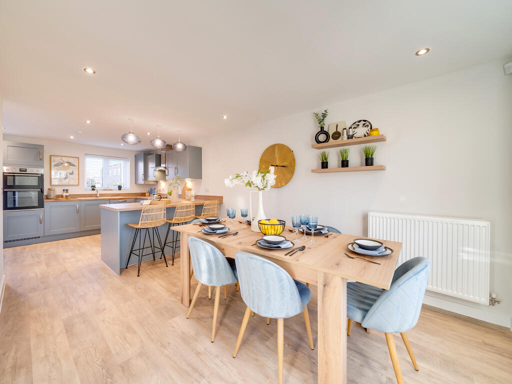 This four-bedroom, detached home enjoys a living room and kitchen/breakfast room that both have French doors to the garden. There’s a dining room, a utility room, a walk-in storage cupboard and a WC. Upstairs, bedroom one is en-suite, three bedrooms share a family bathroom and there’s more storage.