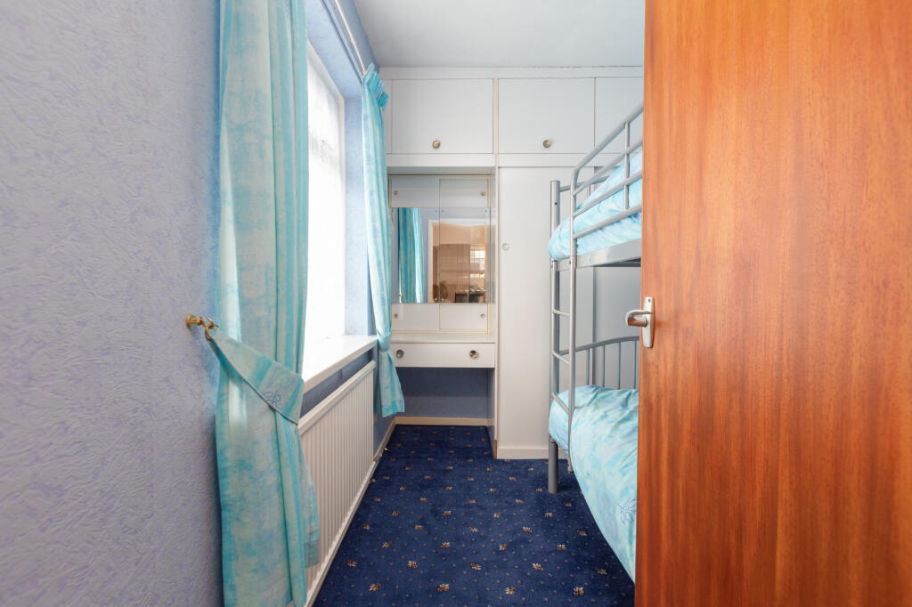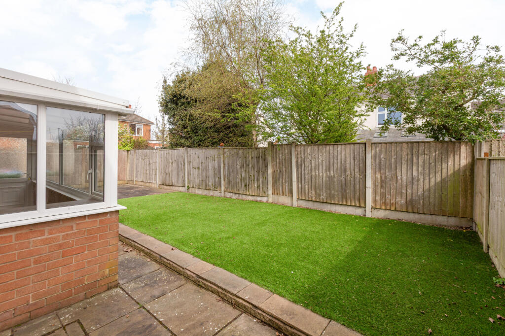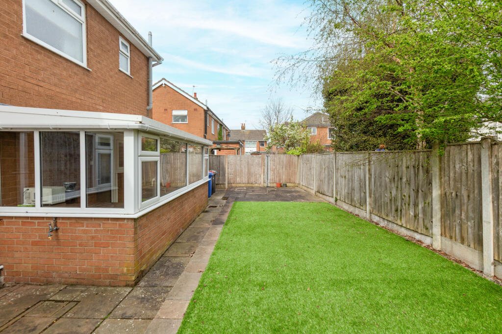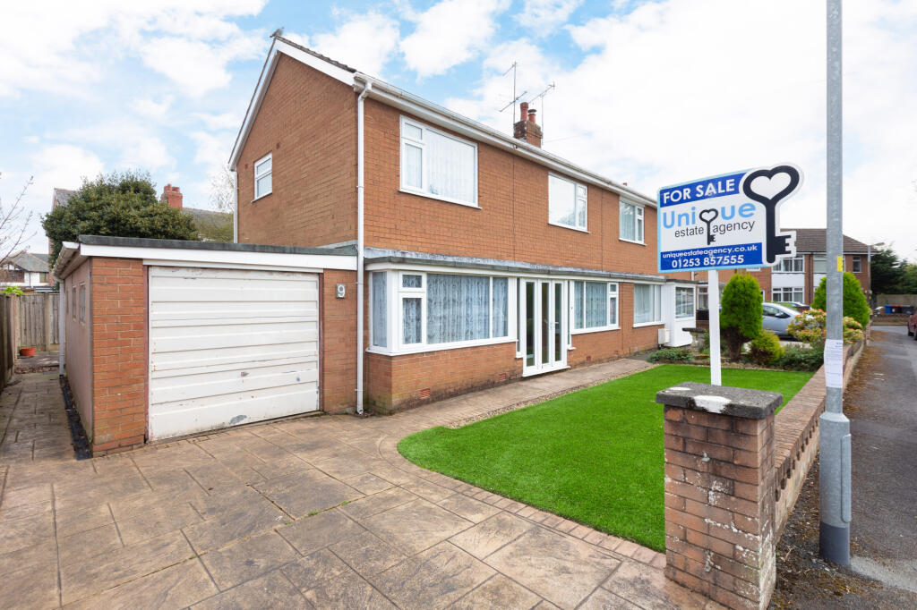 Spacious three-bed semi in a quiet Thornton cul-de-sac. Two large front bedrooms, fitted wardrobes, walk-in bath, separate WC, and a bright kitchen diner leading to a conservatory. Driveway, garage, and low-maintenance rear garden with Indian stone and Astro turf. Scope to modernise.