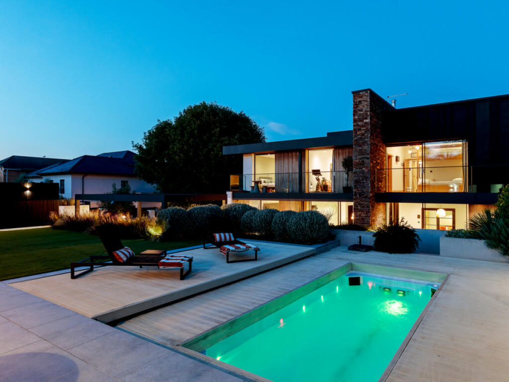 The property itself is presented in excellent condition. The images showcase a modern, high-specification finish throughout, with no apparent need for repair or renovation. The contemporary design and high-quality fixtures and fittings are evident. The landscaping is also a significant feature, adding to the overall appeal.