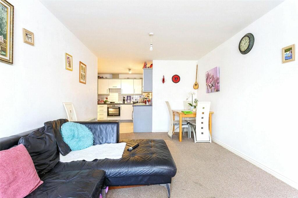 This two-bedroom, first-floor apartment in Farlington, Portsmouth, is marketed as an ideal first-time buy or investment opportunity. The property is part of a modern apartment complex, as shown in the external photos, indicating a relatively modern build. The interior photos reveal a reasonably spacious open-plan living area with a sizeable L-shaped sofa. The kitchen looks functional though modest in size and needs some updating; while the bathroom seems somewhat dated but clean.