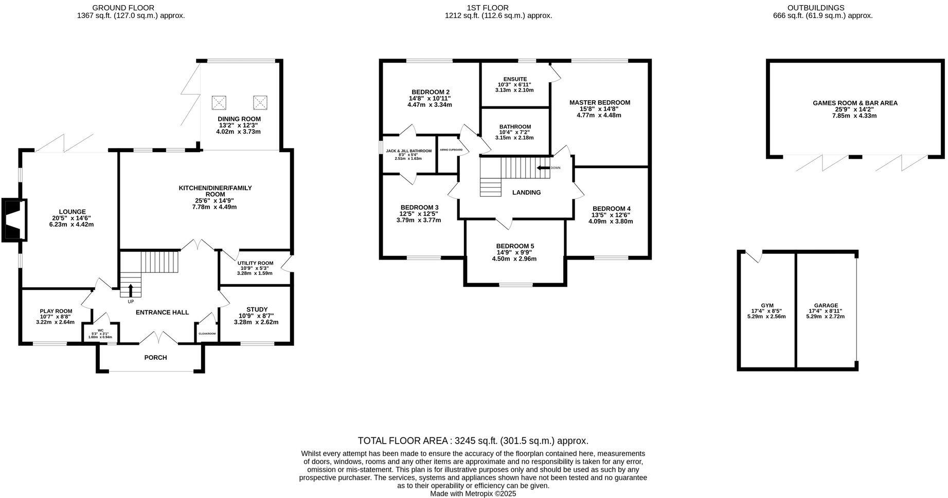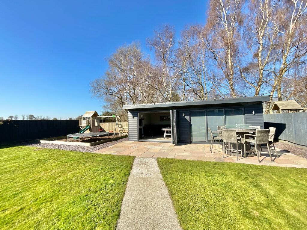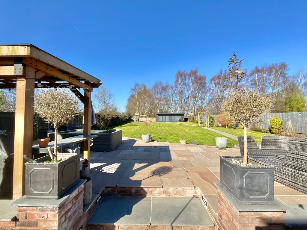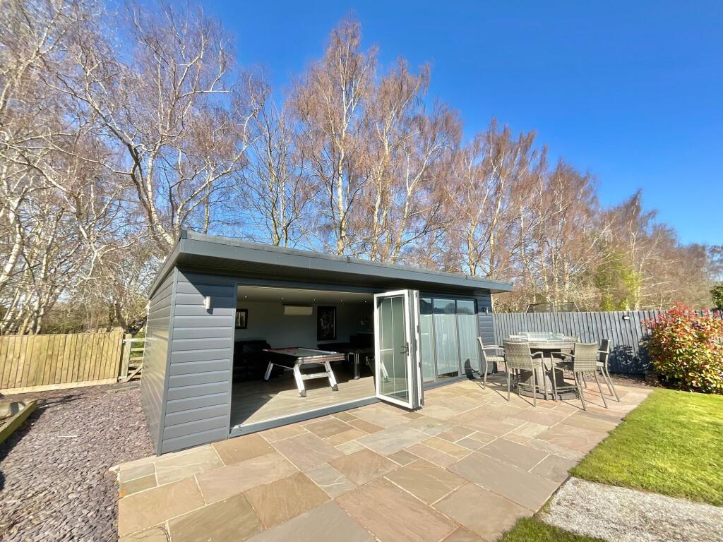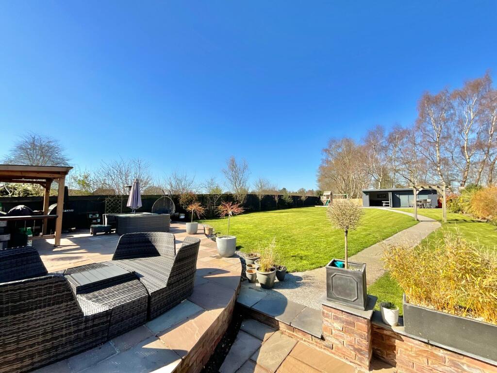 Land: The property boasts a substantial garden. Aerial views reveal a large, well-maintained lawn, patio areas, and a detached garden building which seems to be a games room/bar. The ample outdoor space is a significant feature.