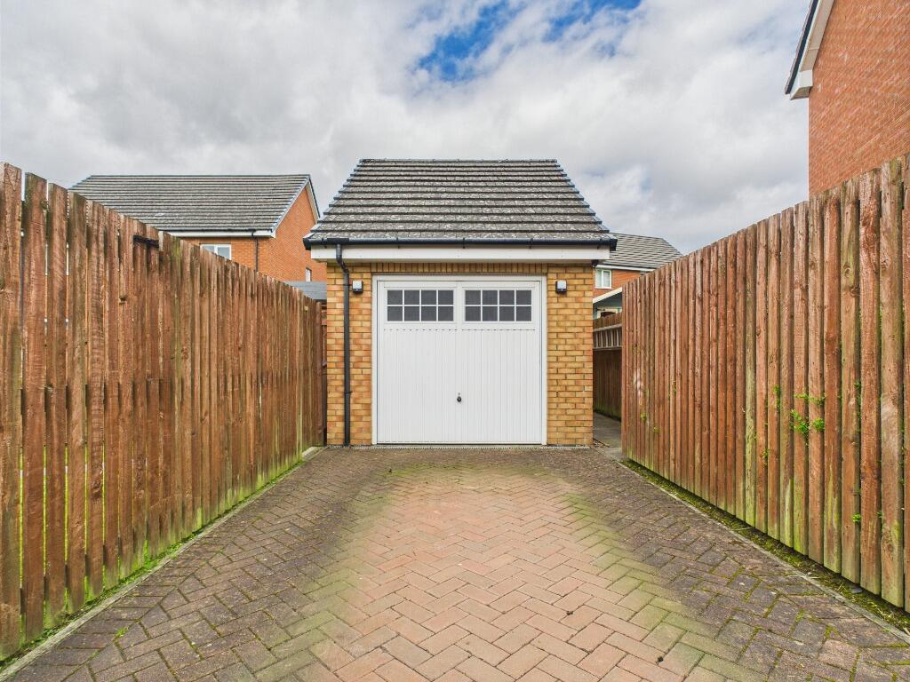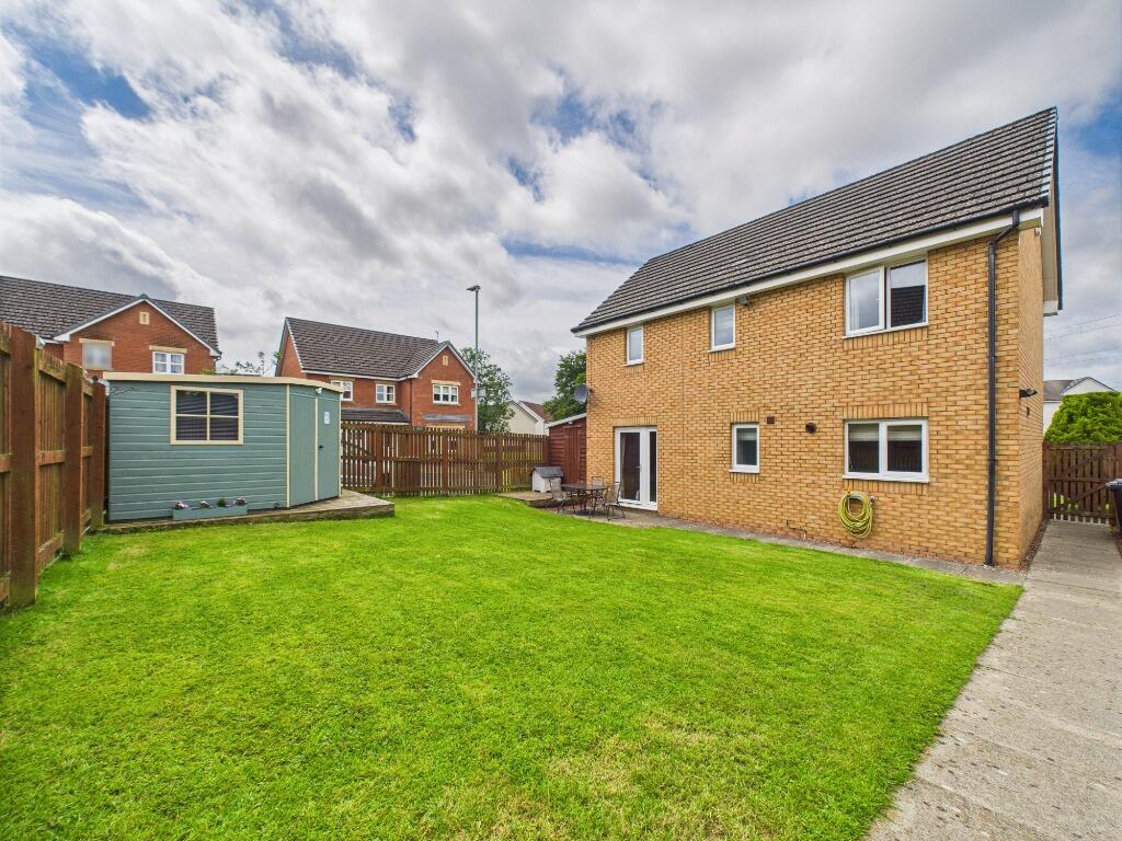 The property is a detached house located in Lindsayfield, East Kilbride. It features 4 bedrooms, 3 bathrooms, a garden with a shed, and a garage with driveway. Nearby transportation includes Hairmyres train station. The property appears to be in good condition with modern fixtures. The price seems reasonable given the square footage and location.