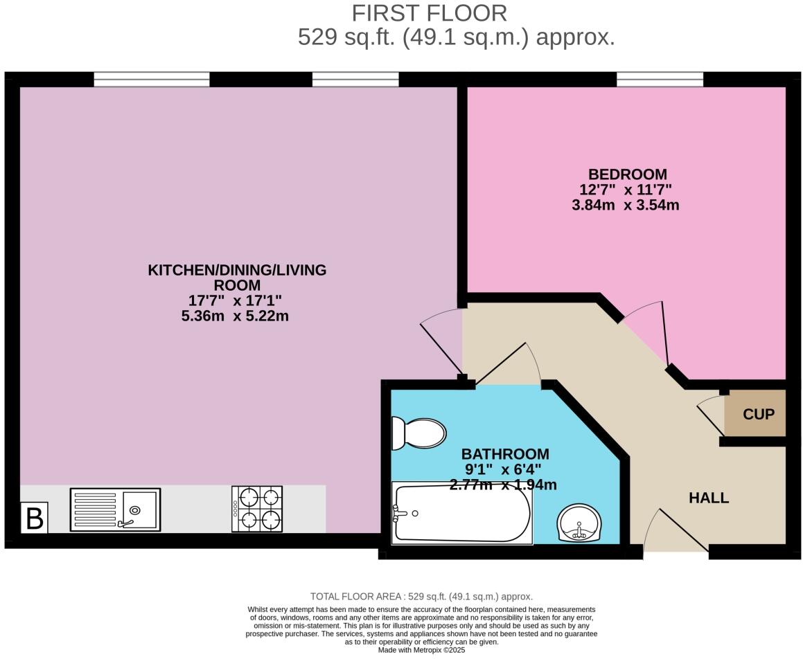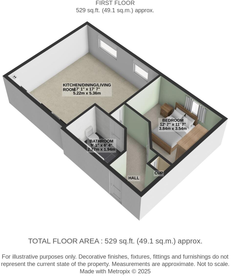 Based on the provided images, the property appears to be in good condition. The interior is modern and well-presented, with a recently updated kitchen and bathroom. There is no visible evidence of significant repairs or renovations needed.