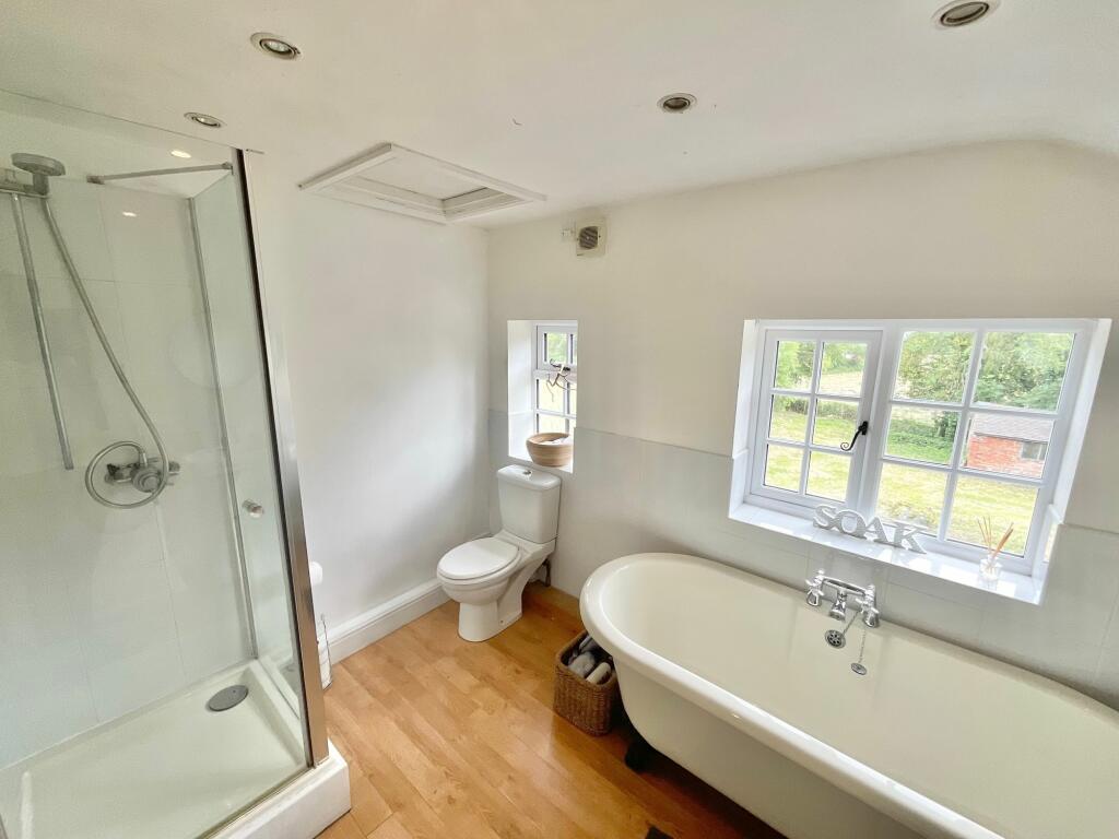 This charming four-bedroom detached farmhouse resides in Broomhall, Cheshire, offering a blend of rural tranquility and accessibility to nearby towns. The property presents a mix of period features – exposed beams, traditional brickwork – combined with modern updates. The interior is generally well-maintained but some areas would benefit from upgrades to achieve a consistently modern aesthetic. The kitchen, in particular, offers a functional space but with a style that could be enhanced with a refurbishment.