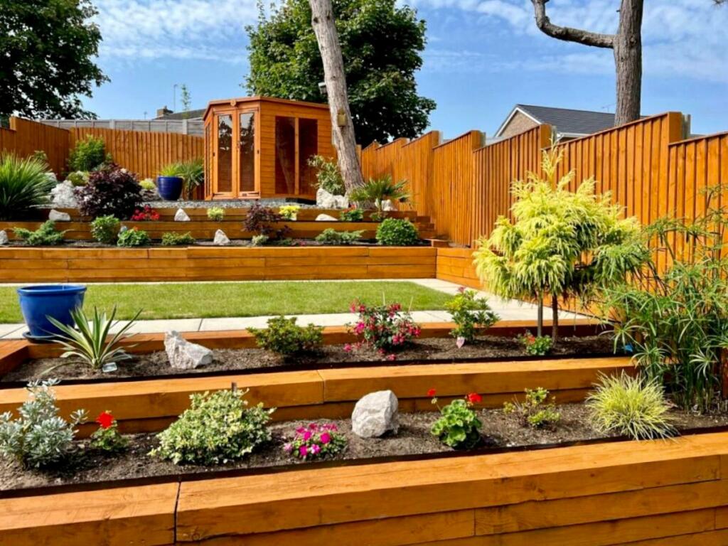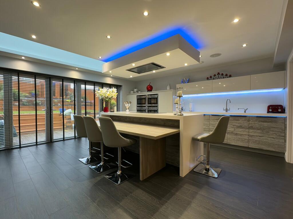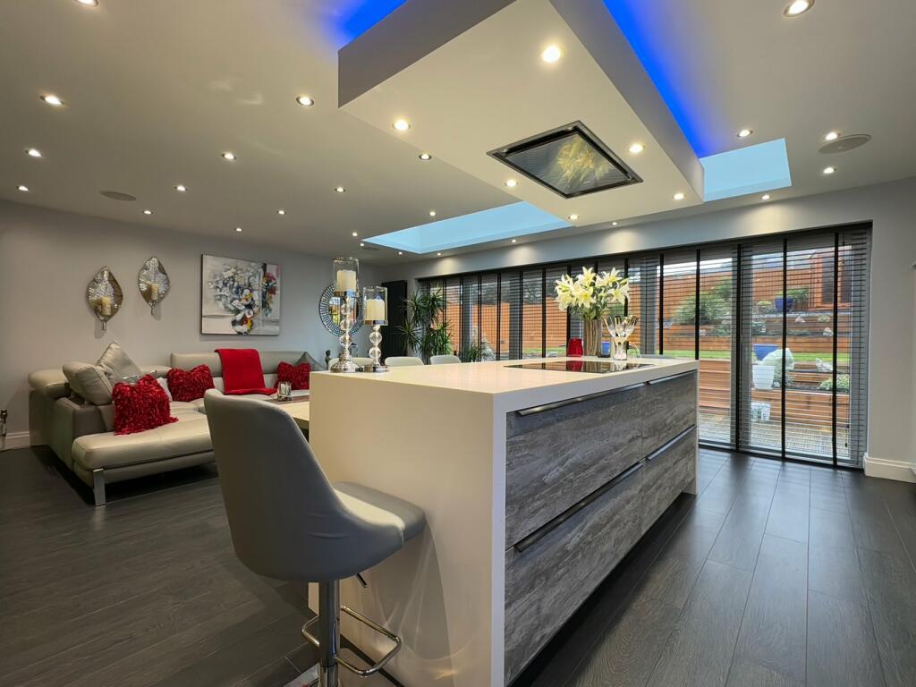 This four-bedroom, three-bathroom detached house in Formby, Merseyside, is presented in exceptional condition. The property boasts a modern, contemporary interior with high-quality finishes and fixtures. The open-plan kitchen/living area is particularly striking, with ample natural light and stylish design. The well-maintained garden, featuring landscaping and tiered planting beds, adds to the overall appeal.