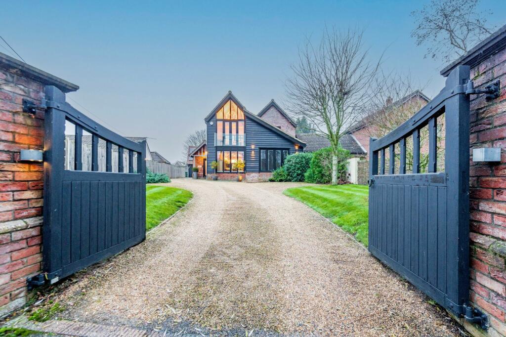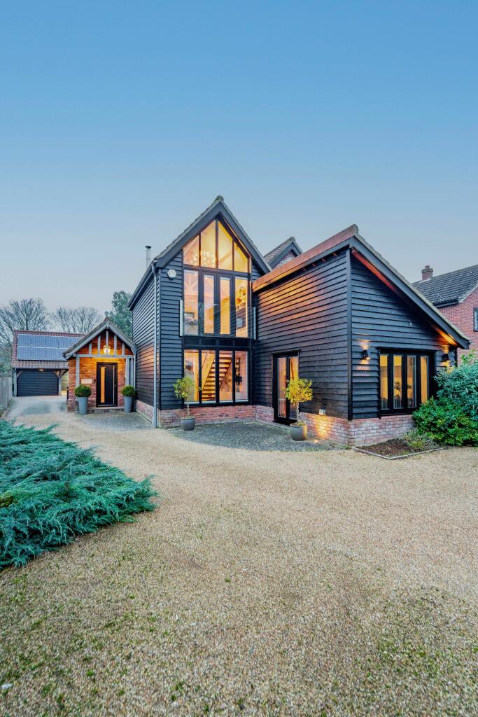 This property is a stunning, contemporary four-bedroom house located in the village of Besthorpe, near Attleborough in Norfolk. The house boasts a high-quality finish throughout and has an open-plan design that is both modern and stylish. The large windows throughout the house allow for plenty of natural light and offer views of the surrounding countryside. The property has a substantial amount of land, including a large garden, patio area with hot tub, and a detached garage/workshop with solar panels. It has a modern and updated design, with a spacious kitchen and multiple bathrooms, with built-in wardrobes in the bedrooms and even a home gym. The house is in excellent condition, and it is a desirable property in the market, potentially attracting high interest from buyers seeking a spacious modern residence in the Norfolk countryside with great access to Attleborough and its amenities. The only downside of the property is the limited local pricing data for accurate evaluation. However, the price is not unreasonable considering the features offered but it is on the higher end of what might be expected in this area.