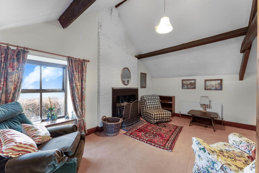 Smithy Cottage is a four-bedroom barn conversion located in the village of Dalston, Cumbria. The property boasts a charming exterior, characterized by its white walls and green window frames. Inside, it presents a traditional style with a mix of rustic and slightly dated features. The kitchen features a prominent red Aga-style range cooker and wooden cabinetry. The living areas include several rooms with exposed beams and a cosy fireplace, adding to the property’s character. The bedrooms also show this traditional style, and the bathrooms appear functional, although some may prefer more modern fixtures.
