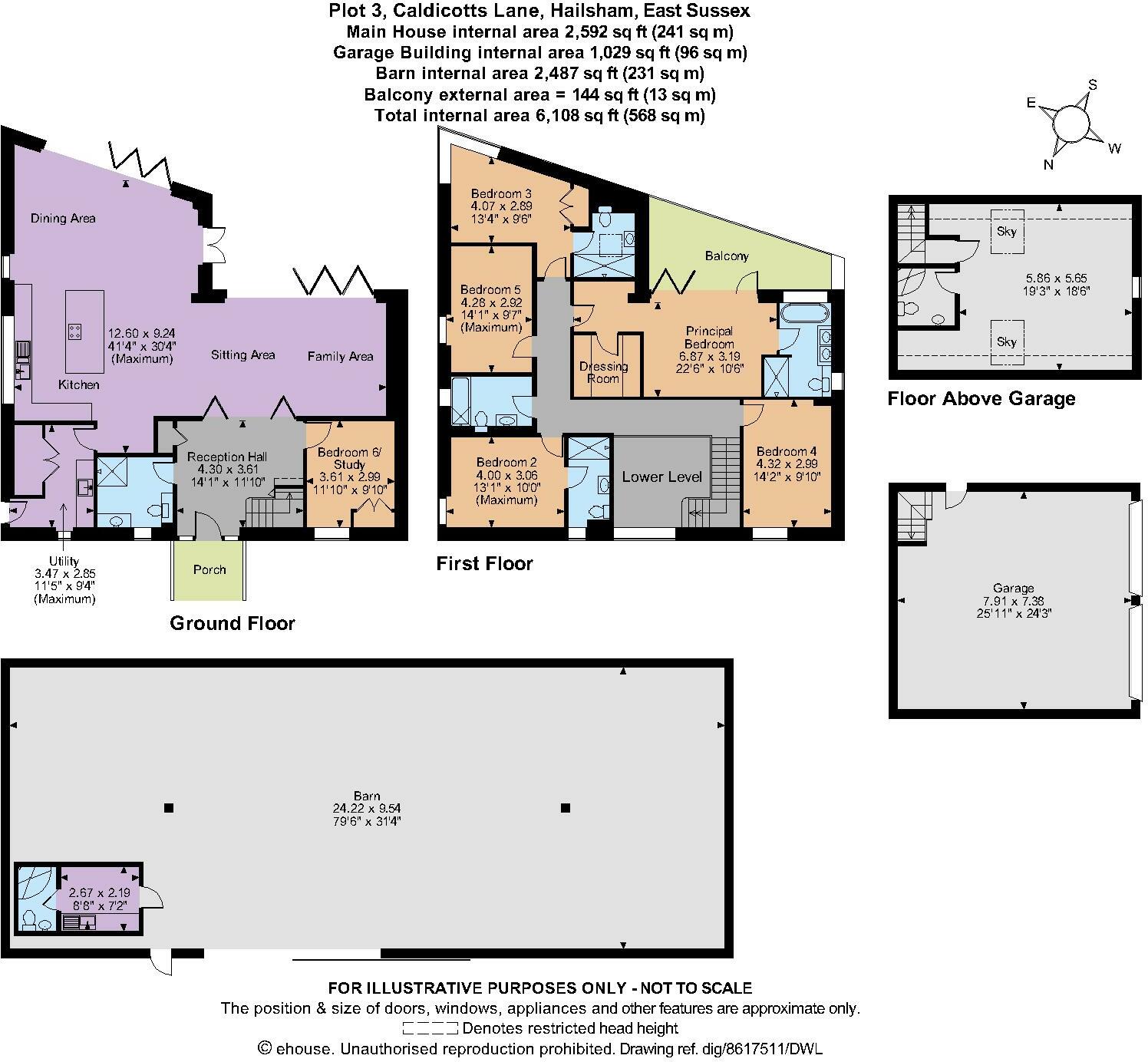 This property is a new, large, contemporary detached house located in the desirable semi-rural location of Lower Dicker, East Sussex. The house features six bedrooms and five bathrooms, suggesting ample living space. The images showcase a modern, open-plan design with high-quality fixtures and fittings. A large expanse of glazing offers excellent natural light and impressive views of the surrounding countryside. The property includes a substantial double garage and outbuildings, with a large area of land.
