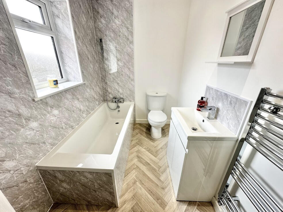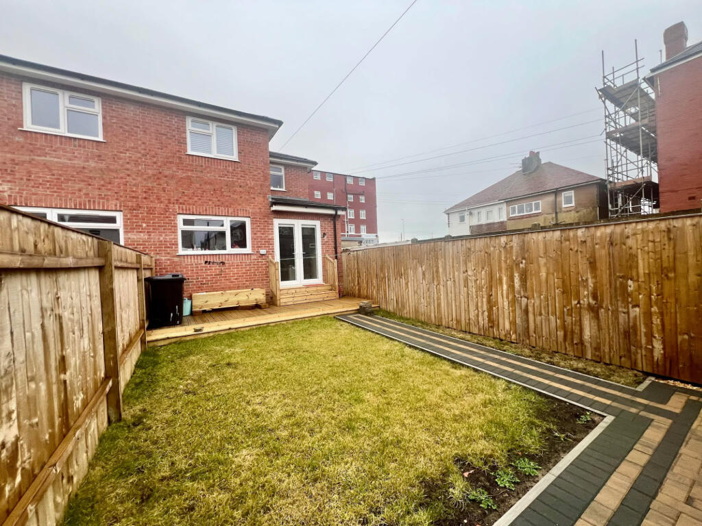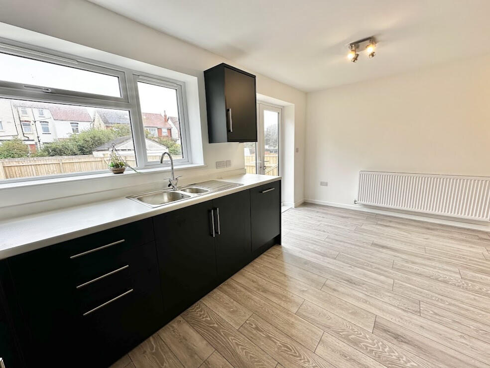 This three-bedroom semi-detached property located on Pennystone Road, Bispham, Blackpool, is presented in excellent condition, suggesting a recent renovation or new build. The interior boasts a modern kitchen with dark cabinetry and integrated appliances, a clean and contemporary bathroom, and well-proportioned bedrooms. The exterior is presented well with a paved driveway and a modest-sized, enclosed rear garden with patio area.